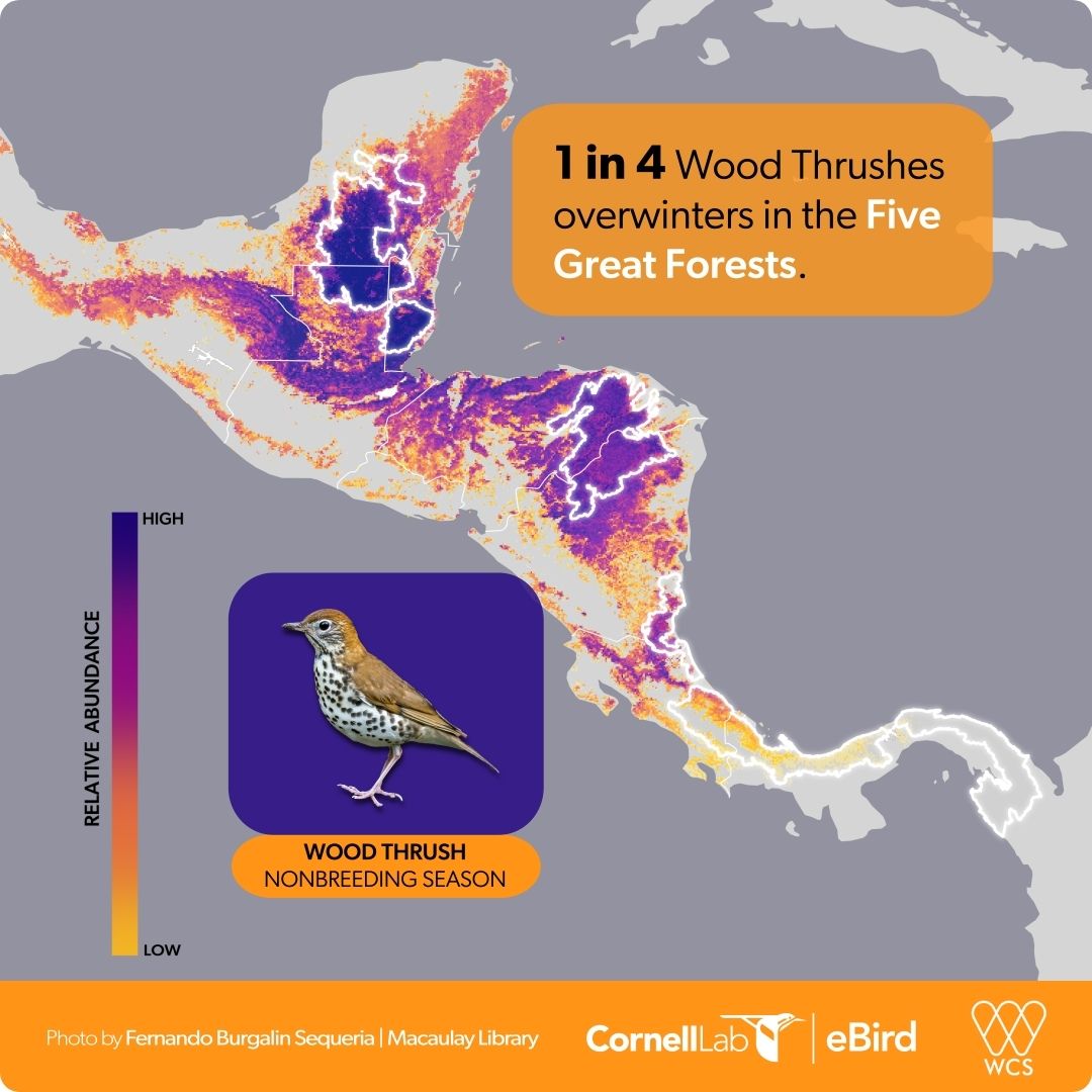These five forests support between one-tenth and nearly one-half of the global populations of 40 migratory bird species, including some of North America’s most rapidly declining birds. More than one-third of the world’s Kentucky Warblers and nearly one-quarter of all Wood Thrushes and Golden-winged Warblers spend the winter within these forests.